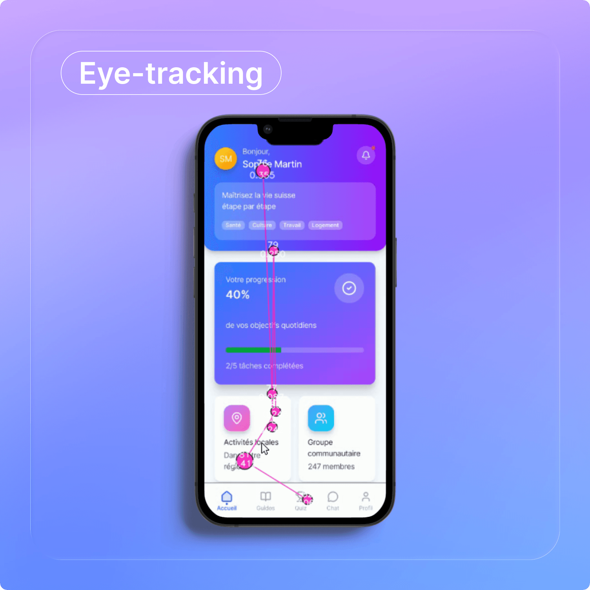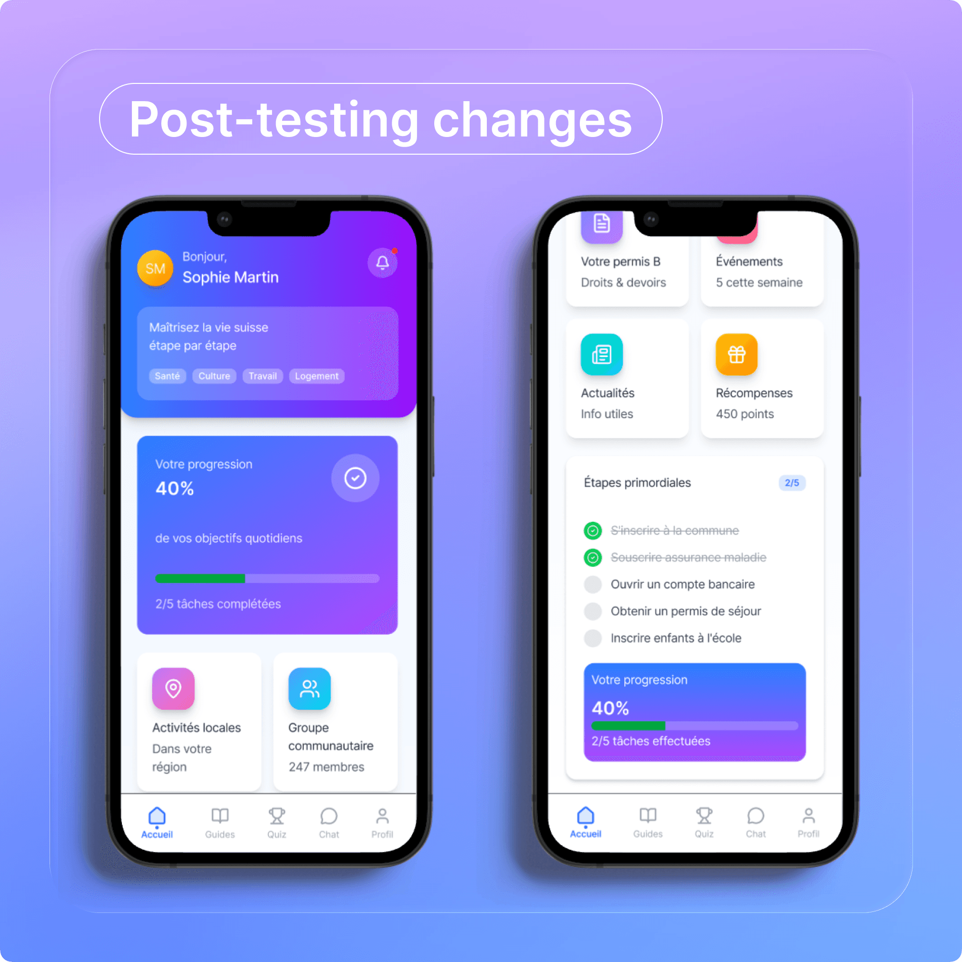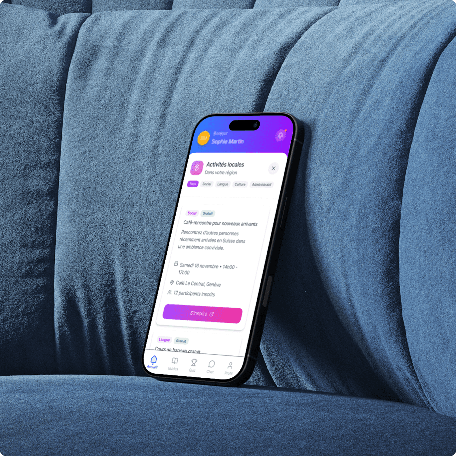 Through an intelligent onboarding system (native language, residence permit, family situation, interests, priorities), the app dynamically adapts content, ensuring that each user receives only what is relevant to their context.