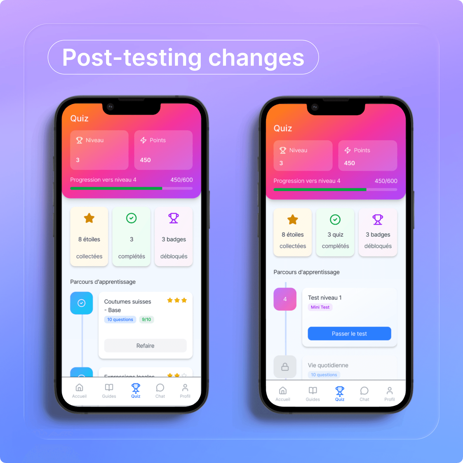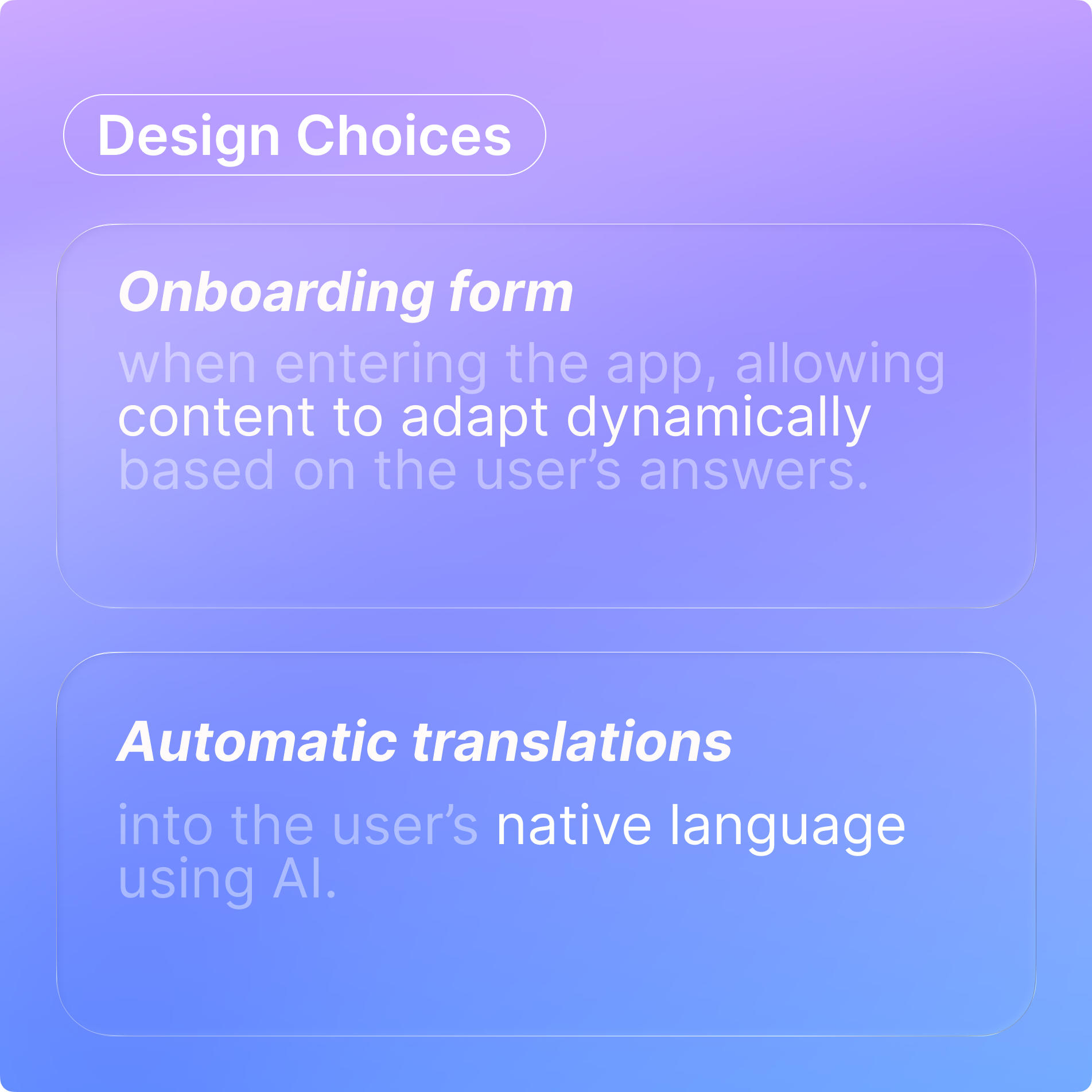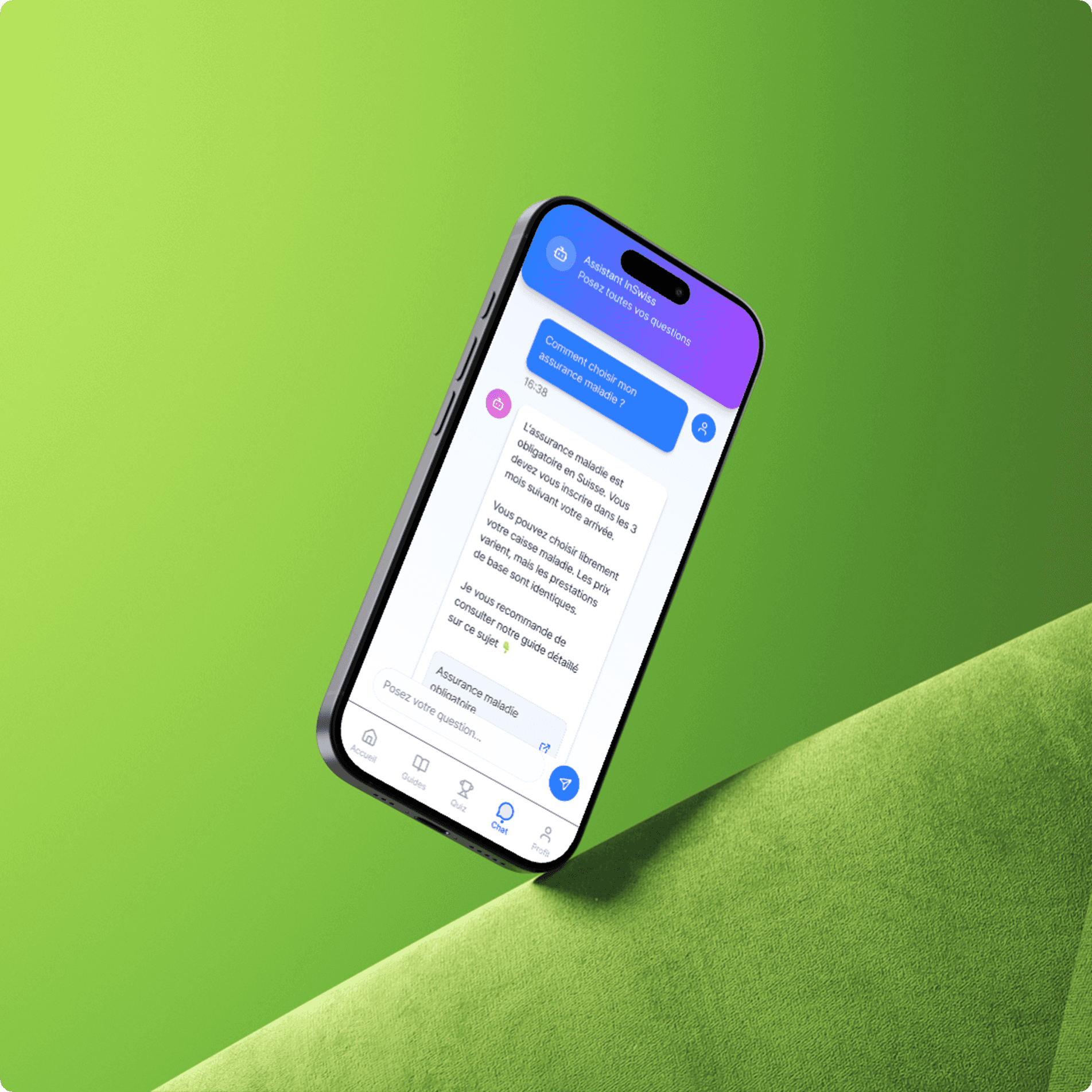 The app uses a tailored onboarding questionnaire to adapt content to each user’s background, language, and needs, offering a personalized and welcoming first experience of life in Switzerland.